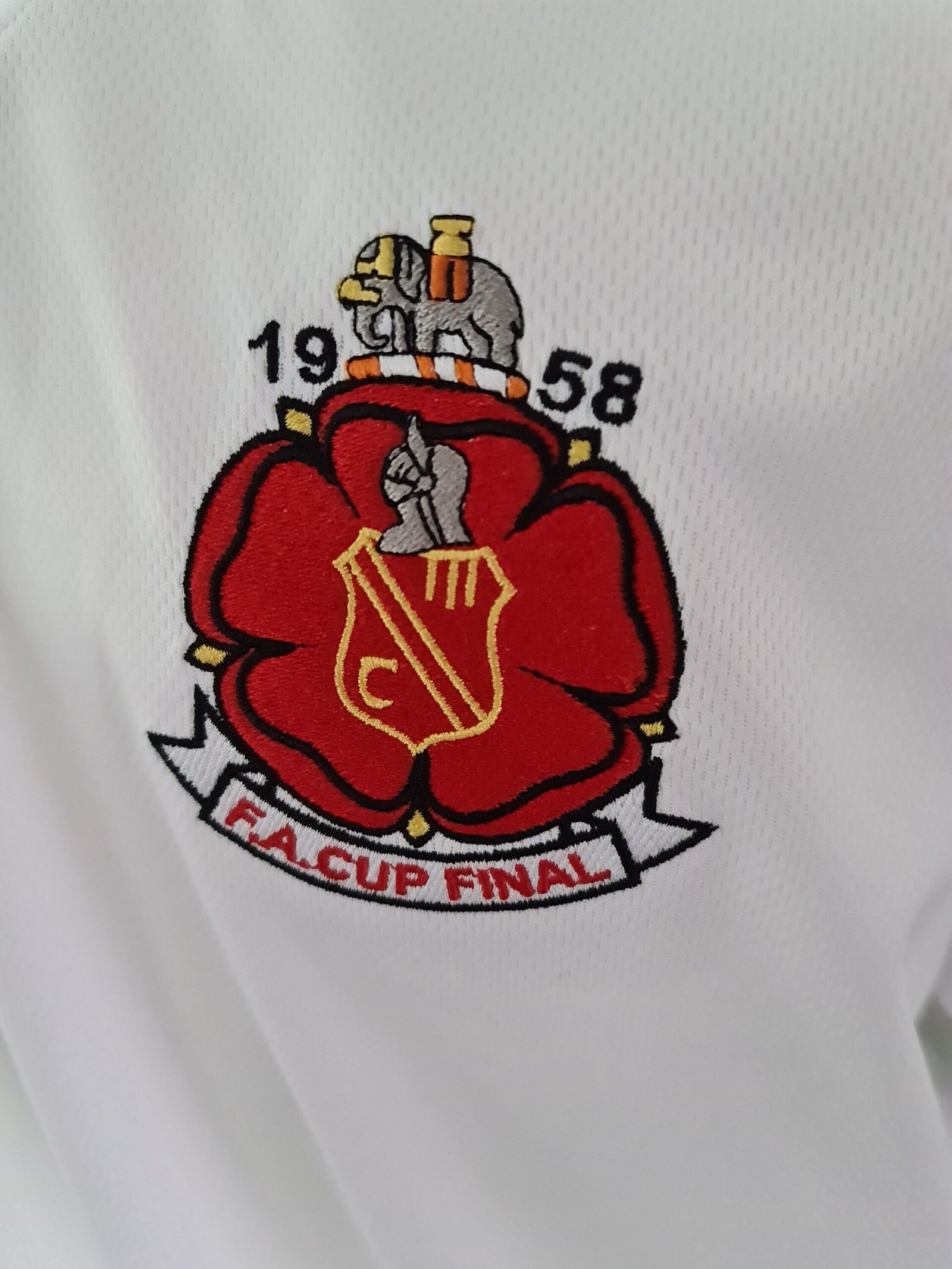 The Final that was widely regarded as the “Nat Lofthouse Final” A large Lancashire Rose was worn, as from earlier in Wanderers history. This crest was different however, in that its stated the Final underneath with the 1958 year. In commemoration, we have also had the number ‘9’ to the back in recognition of the great man himself. The plunging collar with 4 buttons completes this Bolton must-have!