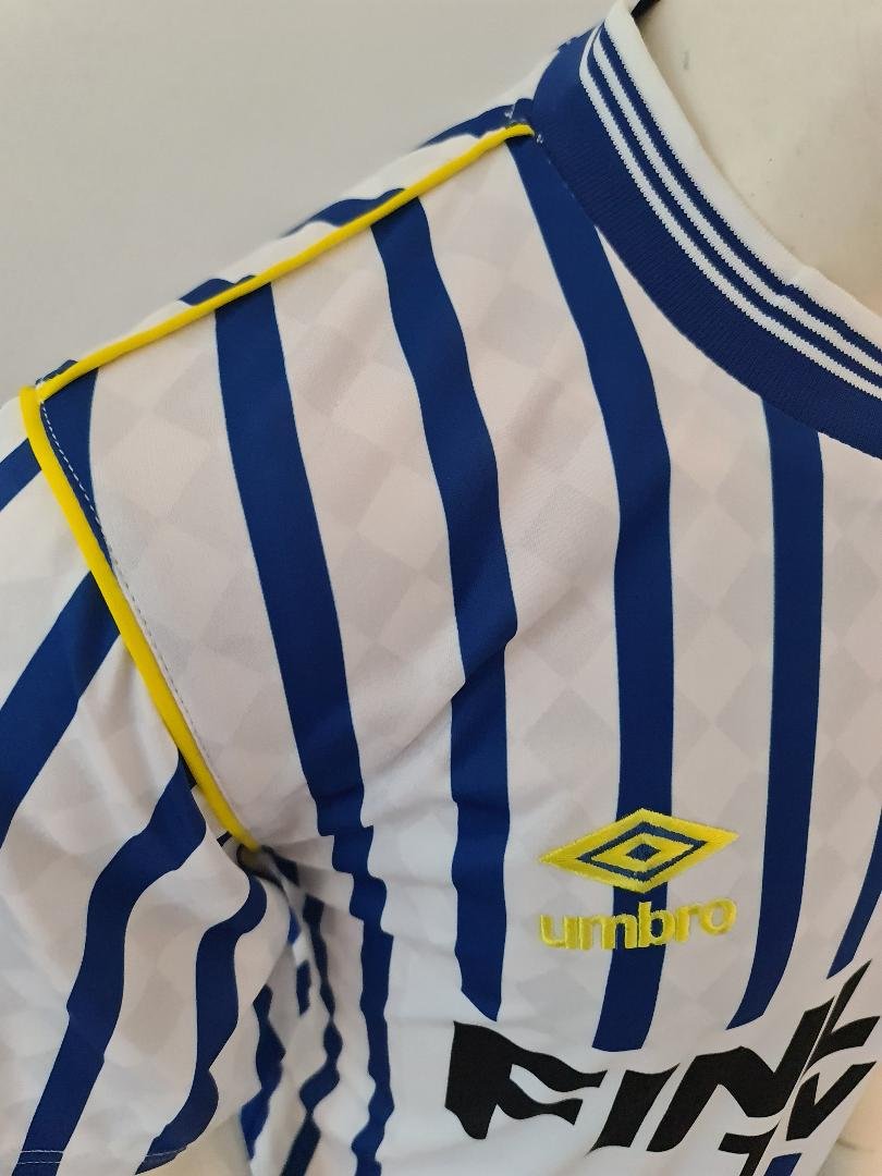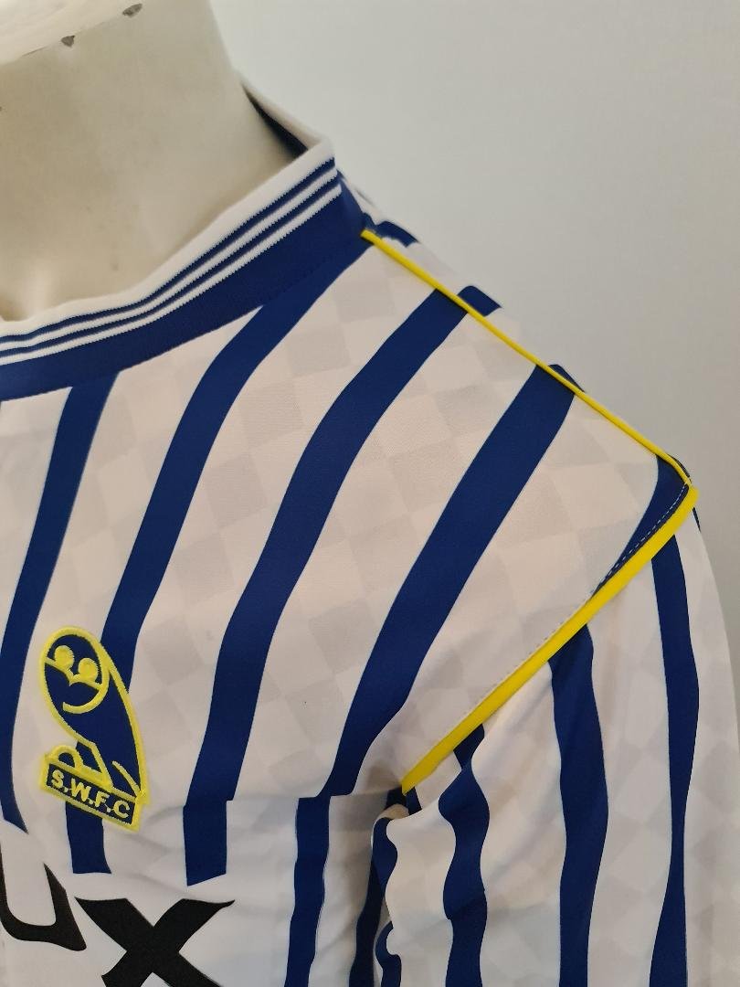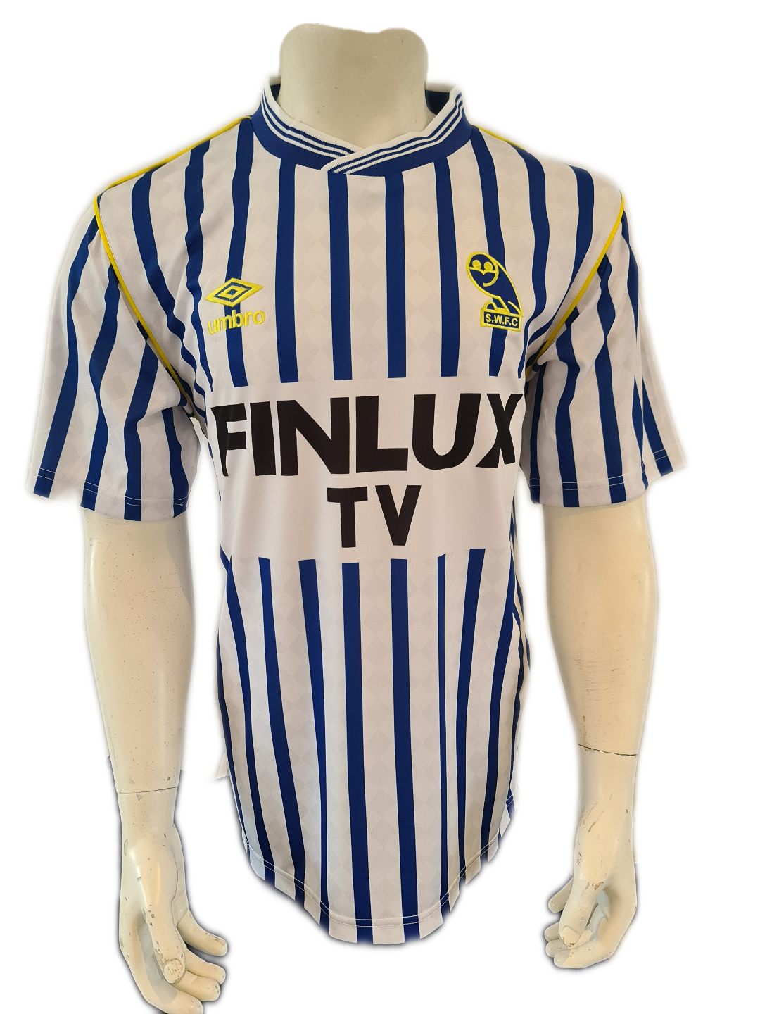 A pin stripe classic from the Wednesday archives from the late 80s. Finlux was the shirt sponsor and it was manufactured by Umbro. Its the last time SWFC played in pin stripes as the thicker, more traditional blue stripes have been adopted. Each badge is embroidered.